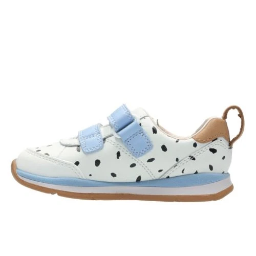 Ferris Vibe Fst, babies shoes, white combi leather- Using the retro runner profile, these sporty babies shoes mix a white leather upper with a unique print, veg tan accents, decorative stitch detail and a heel loop tab. With